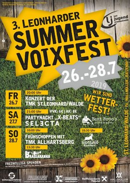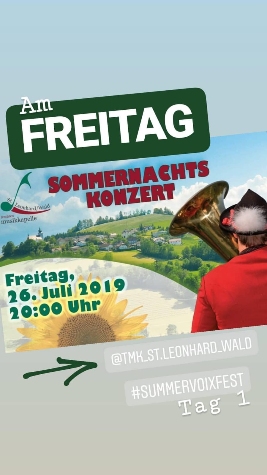 Das Highlight des Jahres, war das 3. Leonharder Summer Voixfest vom 26.07.-28.07.2019 in St. Leonhard/Wald bei der Firma Wallmüller "Ratzenöd". Eröffnet wurde das "Summer Voixfest" am Freitag um 20:00 Uhr mit dem Sommernachtskonzert der TMK St. Leonhard/Wald unter der Leitung von Kapellmeister Sebastian Heigl. Am Samstag folgte DIE Partynacht "X-Beats" mit DJ Selecta und den Beat Broo's. Der traditionelle Sonntag, vom "Summer Voixfest" begann mit dem Frühschoppen der TMK Allhartsberg. Danach übernahm die böhmische Gruppe "Brassaranka" die musikalische Umrahmung. Am Abend sorgten die "Kronwildkrainer" für den perfekten Ausklang des Wochenendes. Zwischen den verschiedenen Musikgruppen absolvierten die VTG Gresten und die Schuhplattlergruppe Konradsheim imponierende Auftritte. Mit dem Kistenklettern, einer Schießbude und der Kinder Go-Kart Bahn war das Rahmenprogramm vom 3. Leonharder Summer Voixfest perfekt. Durch das abwechslungsreiche Programm war für jeden etwas dabei. Die zahlreichen Gäste und die tolle Stimmung machten die viele Arbeit aus den Vorbereitungen wieder wett. Vielen Dank an unsere Sponsoren, der TMK St. Leonhard/Wald für die gute Zusammenarbeit und allen fleißigen Helferleins! P.S: Weitere Fotos findet ihr auf unserer Facebookseite!
