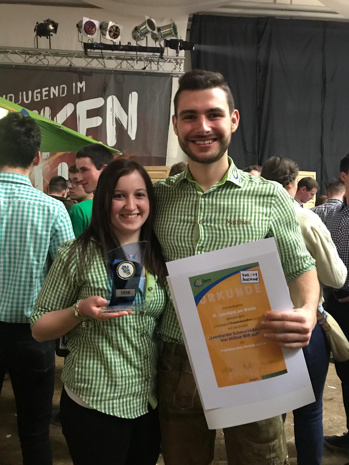 "Leonharder Schmückkästchen - hier blühen WIR auf" Am 16. März 2019 war es endlich soweit und der Projektmarathon 2018 wurde beim Tag der Landjugend in Wieselburg feierlich prämiert. Das Tüfteln, Schwitzen, Betonieren, Gärtnern, Umgraben, Bauen, Gestalten, Baggern, Basteln, Kreieren, Singen und Präsentieren hat sich ausgezahlt - unser Projekt - das "Leonharder Schmückkästchen - hier blühen WIR auf" wurde mit GOLD ausgezeichnet. Matthias und Eva nahmen den Preis von Landeshauptfraustellvertreter Dr. Stephan Pernkopf und der NÖ Landesleitung entgegen und wurden mit großem Jubel der Mitglieder unterstützt. Vielen Dank an an alle Personen, von denen wir etwas ausborgen durften, die uns unterstützten, aber vor allem DANKE an unsere Mitglieder!